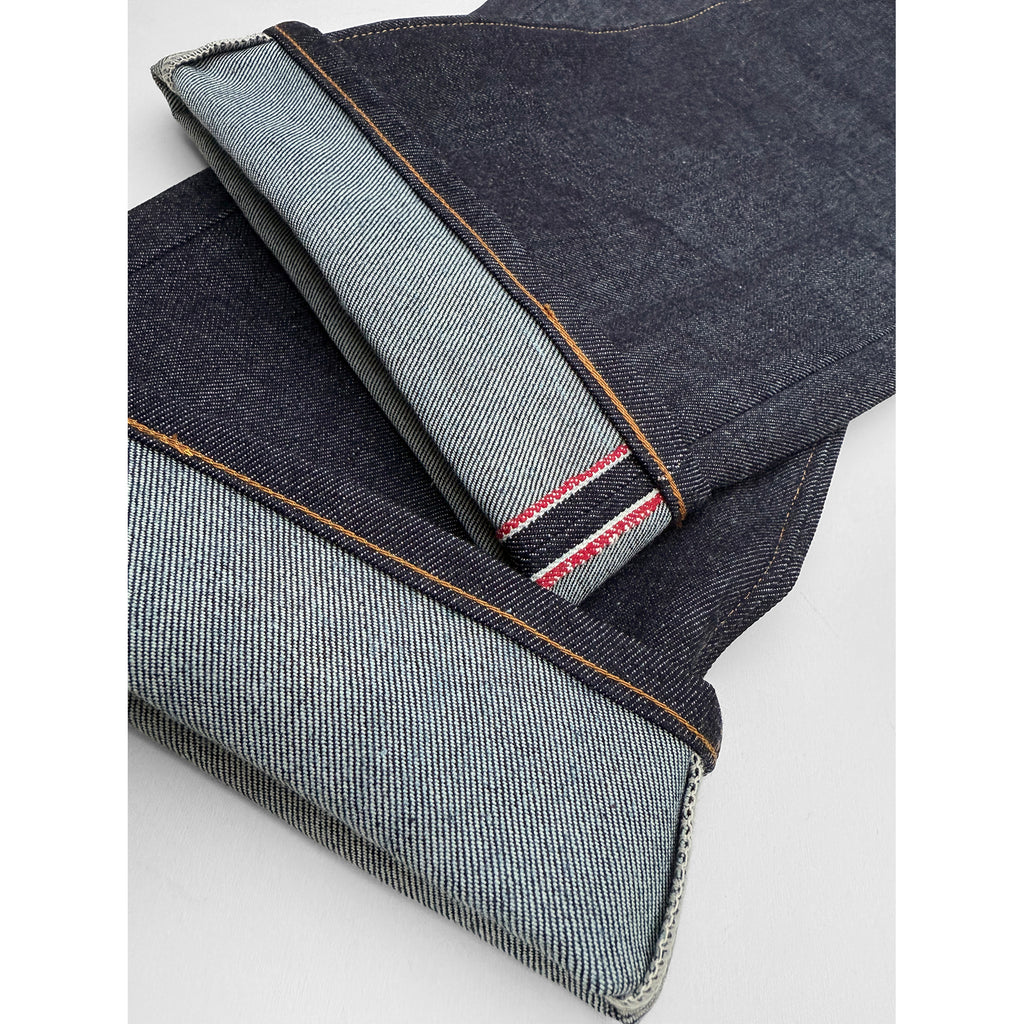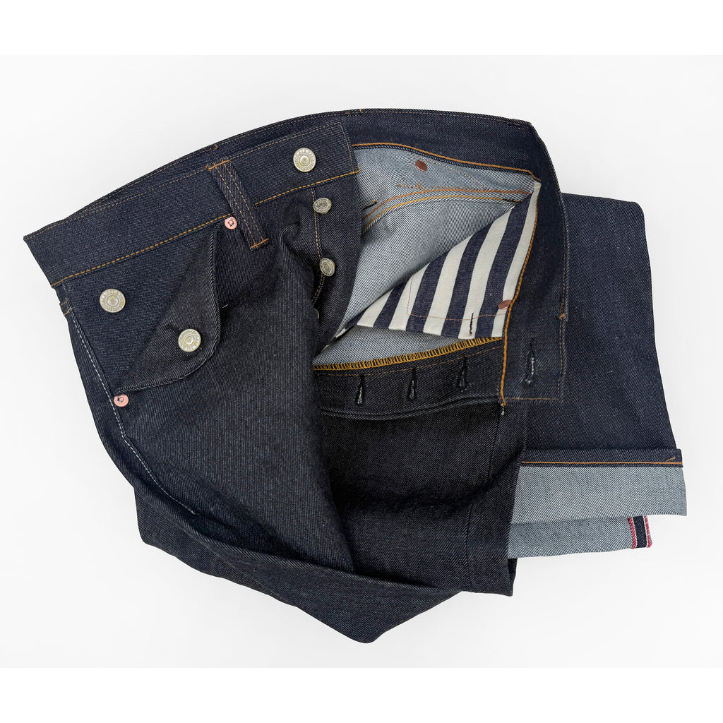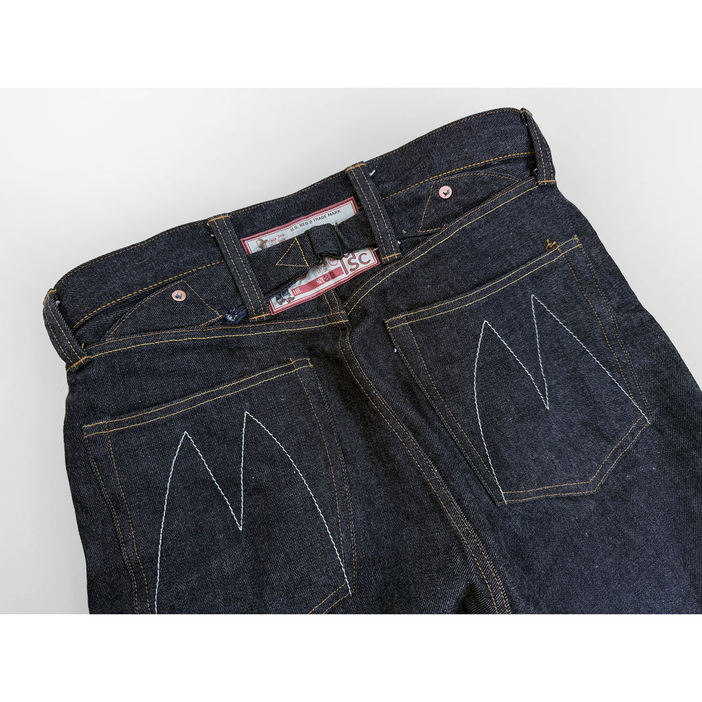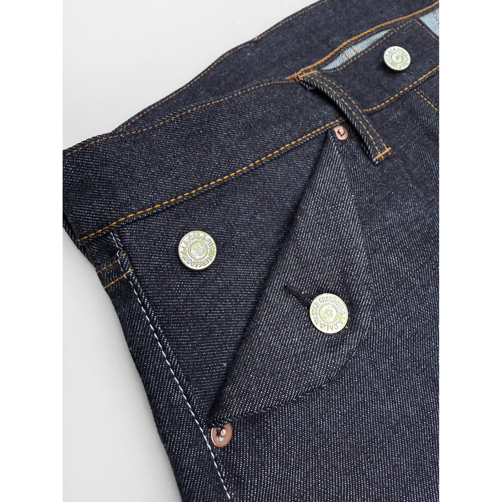 These dungarees are a departure from the average five-pocket jeans, and feature an intricate rear cinch strap pattern. This ‘buckle-back’ style is not lifted from any vintage sample, but came out of the drawing table of our Los Angeles atelier, and trial & error prototype making.