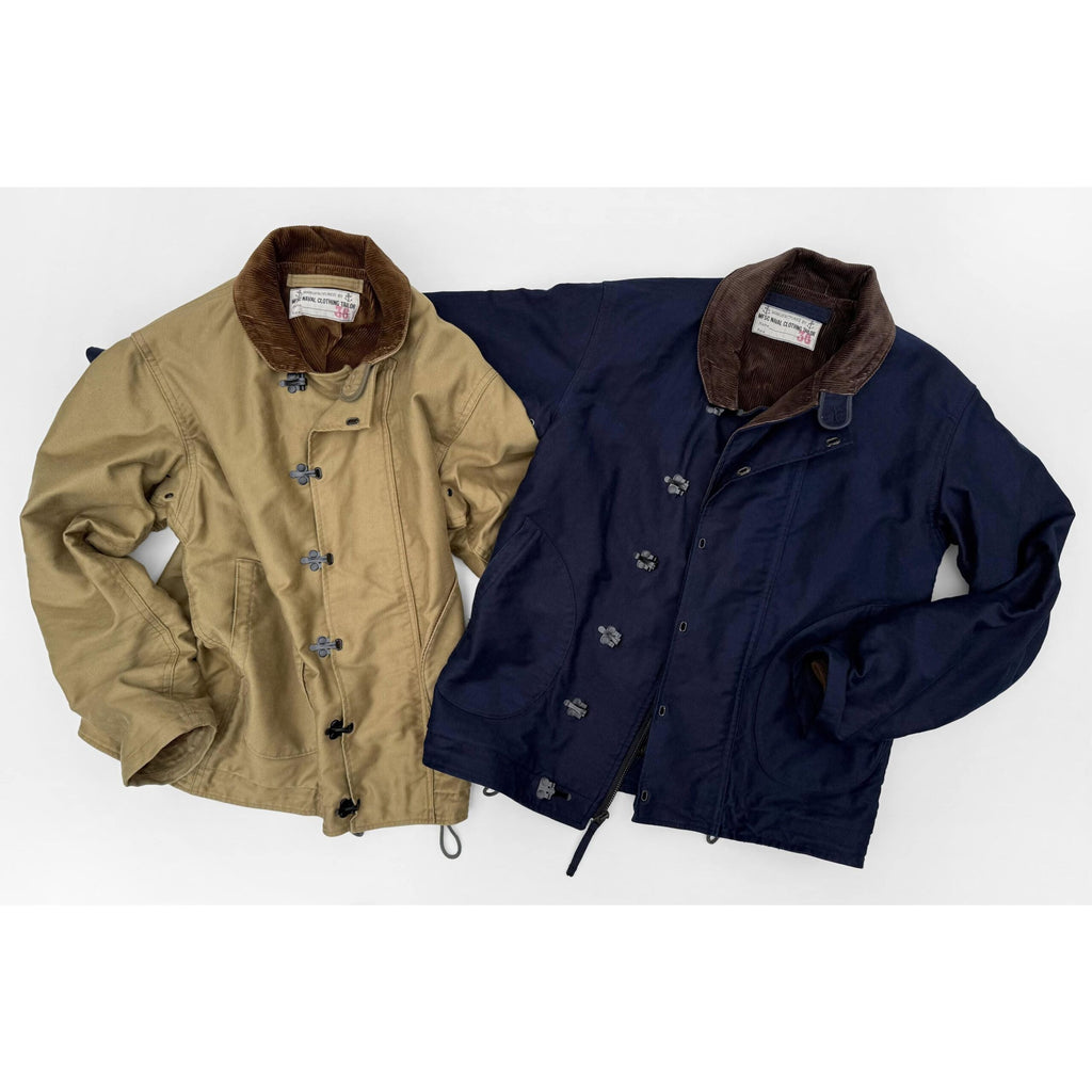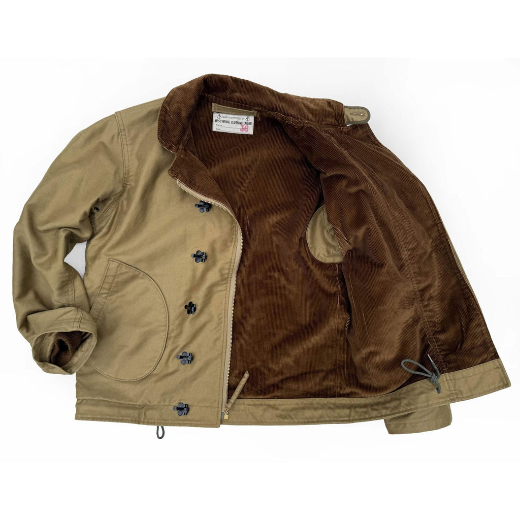 A modified version of the original Mister Freedom® N-1H Deck Jacket (H was for hook) we introduced back in 2008, combining several USN N-1 Deck jacket types into one classic “might have been” design. This 2025 edition differs by featuring a mid-weight wide-wale corduroy lining, as we substituted the Mil-Specs bulky alpaca pile/wool blanket lining of vintage originals with a lighter fabric, for a more versatile all-season jacket.