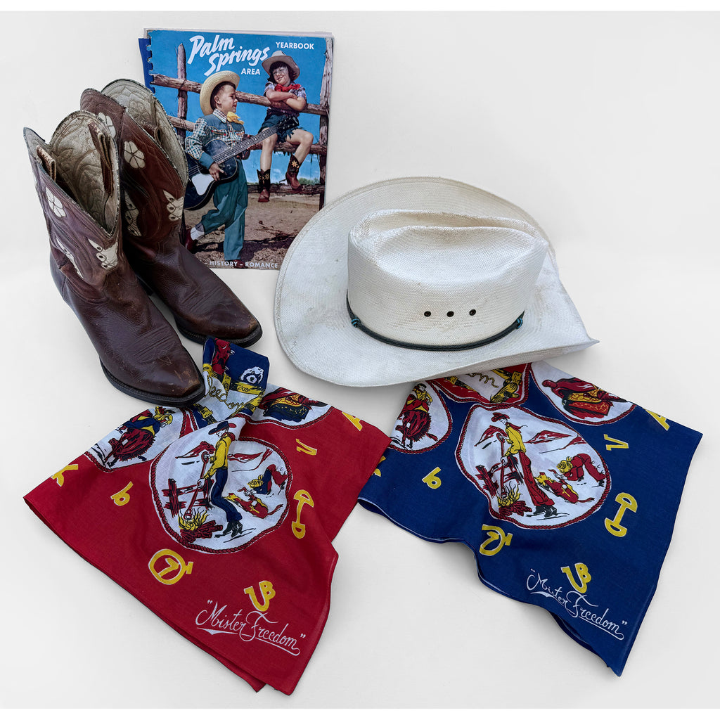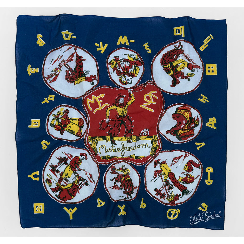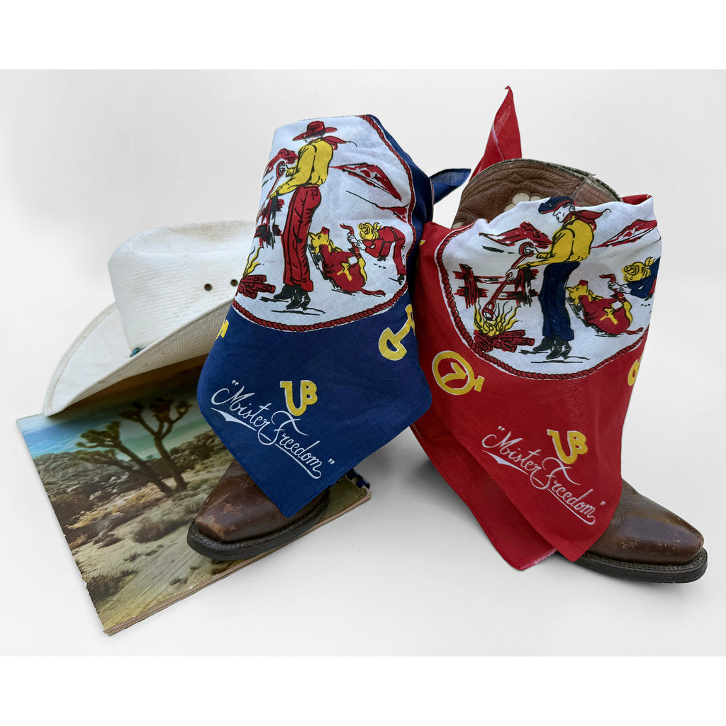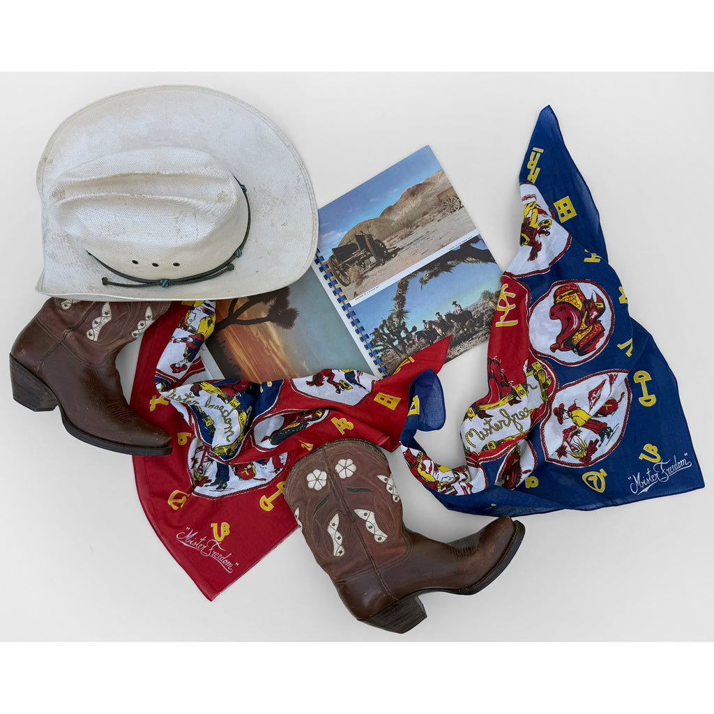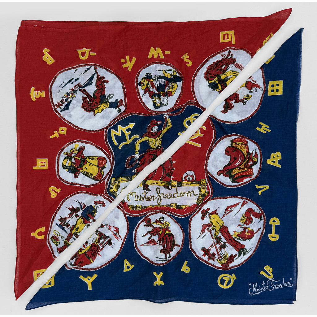 We dug-out some vintage Old West-related silk scarves from the Mister Freedom® archives for inspiration, and put together this original “RANCH KERCHIEF”, in full 1950s-60s “dude ranch” tenderfoot fashion.