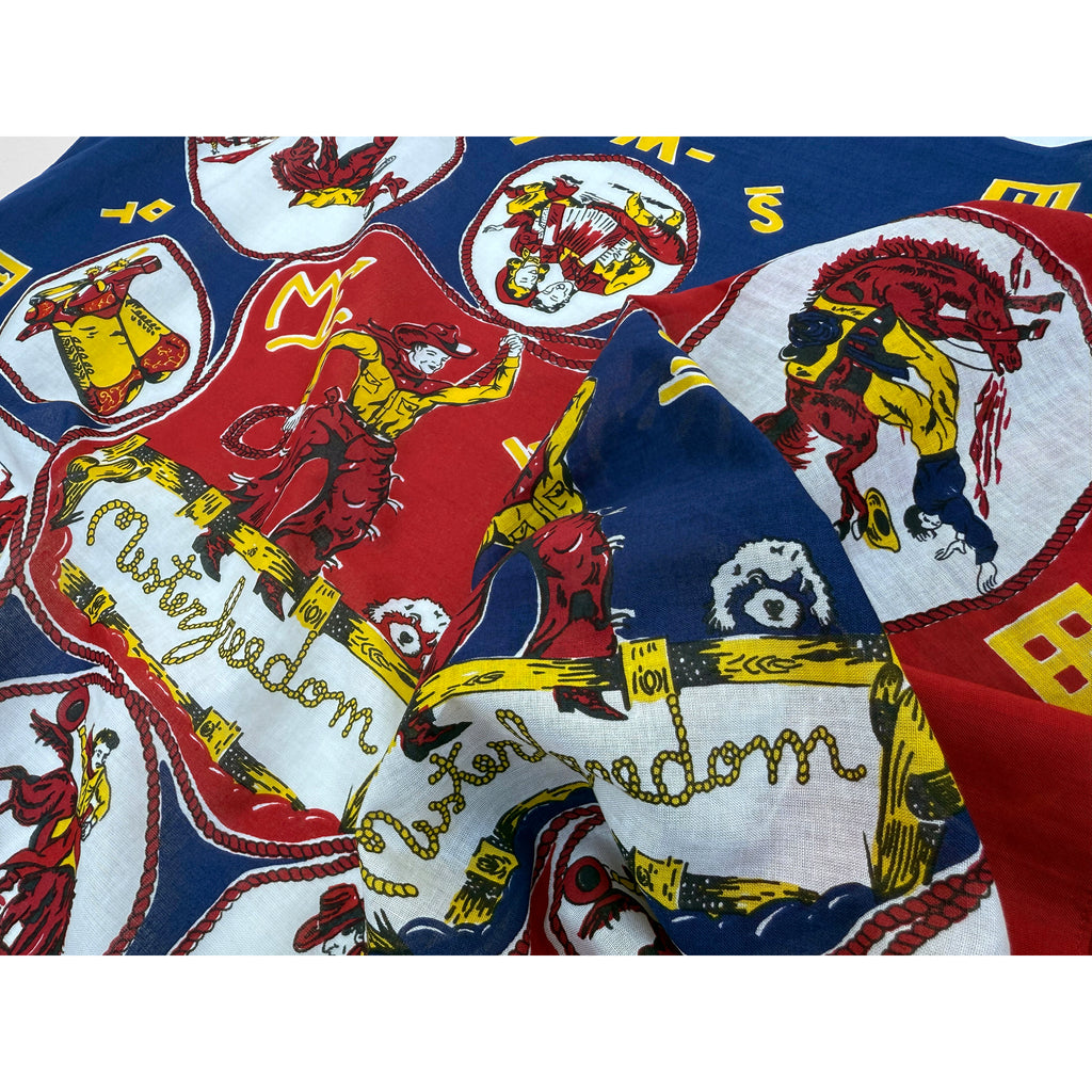 Like most traditional 1950s-1960s fashion or promotional bandanas, our RANCH KERCHIEF features three sides machine-hemmed and one side using the fabric selvedge, an old sign of fabric yield maximizing.